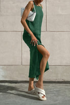 This long dress captivates with its minimalist style and fluid drape that naturally enhances the silhouette. Its clean cut and discreet side slits make it a perfect piece to combine comfort and refinement. Light and pleasant to wear, it adapts well to sunny days as well as moments of relaxation on vacation.