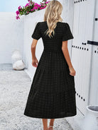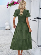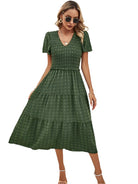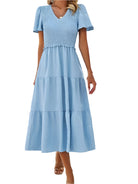 Tato bohémská chic šaty s krátkými rukávy jsou ideální pro uvolněný a elegantní vzhled. Její smockovaný pas zvýrazňuje siluetu, zatímco její volný střih zajišťuje maximální pohodlí. Perfektní na léto, výlety nebo slunečné dny.