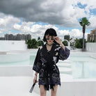 Esta chaqueta kimono para mujer está adornada con un estampado refinado que representa aves japonesas, símbolos de armonía y gracia. Su corte amplio y fluido asegura una comodidad perfecta, ya sea para un look casual o un atuendo más elegante.