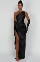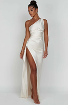 Tämä pitkä epäsymmetrinen mekko on korostettu sivuhalkiolla. Sen tyylikäs ja mukava leikkaus tekee siitä täydellisen valinnan iltoihin ja juhlatilaisuuksiin.