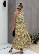 Tämä pitkä boheemimekko viehättää kirkkaalla kukkakuviollaan ja hienolla solmittavalla kauluksellaan. Sen virtaava leikkaus korostaa siluettia hienovaraisesti samalla kun se tarjoaa täydellistä mukavuutta kuumina päivinä. Täydellinen kesäretkelle tai kaupunkikävelylle.