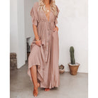 Ez a hosszú, légies ruha elegáns és laza sziluettet kínál. Mély dekoltázsa kiemeli a sziluettet. Tökéletes napos napokra vagy nyári estékre.