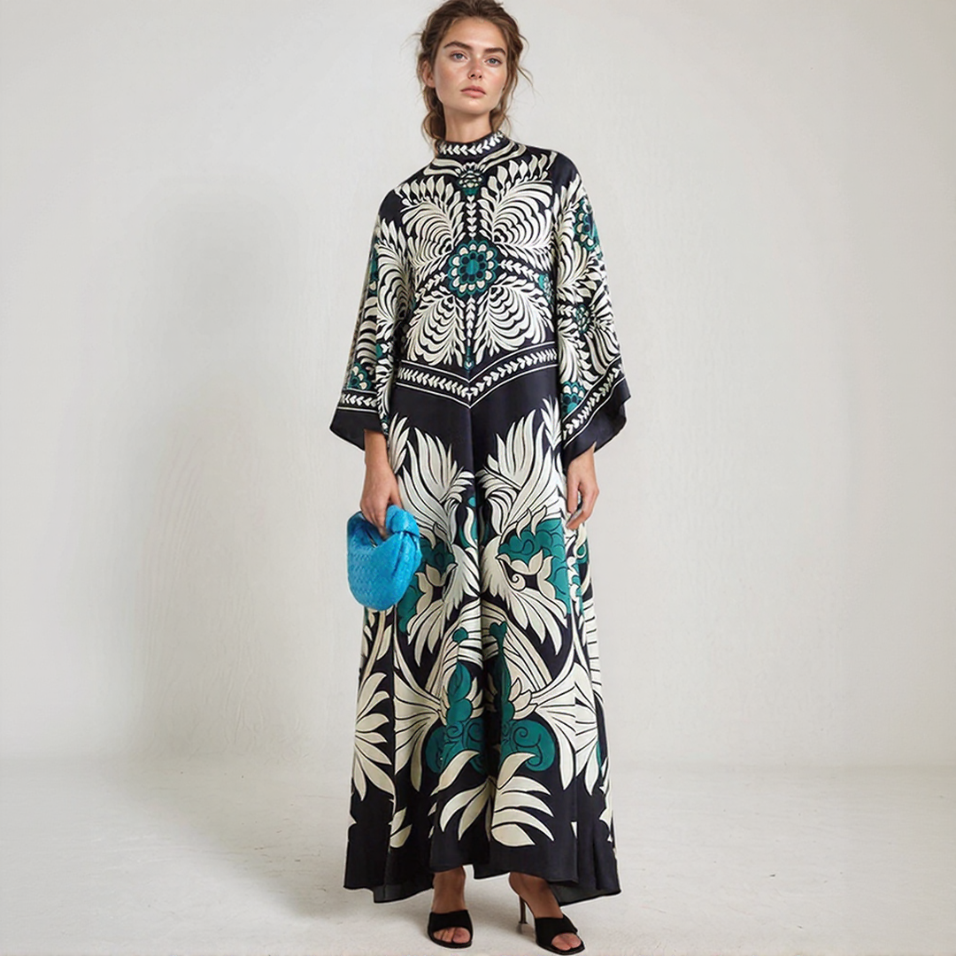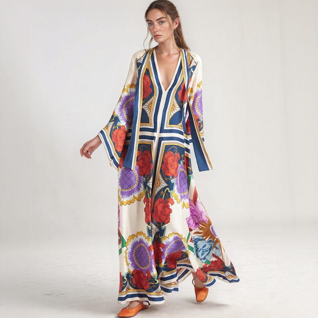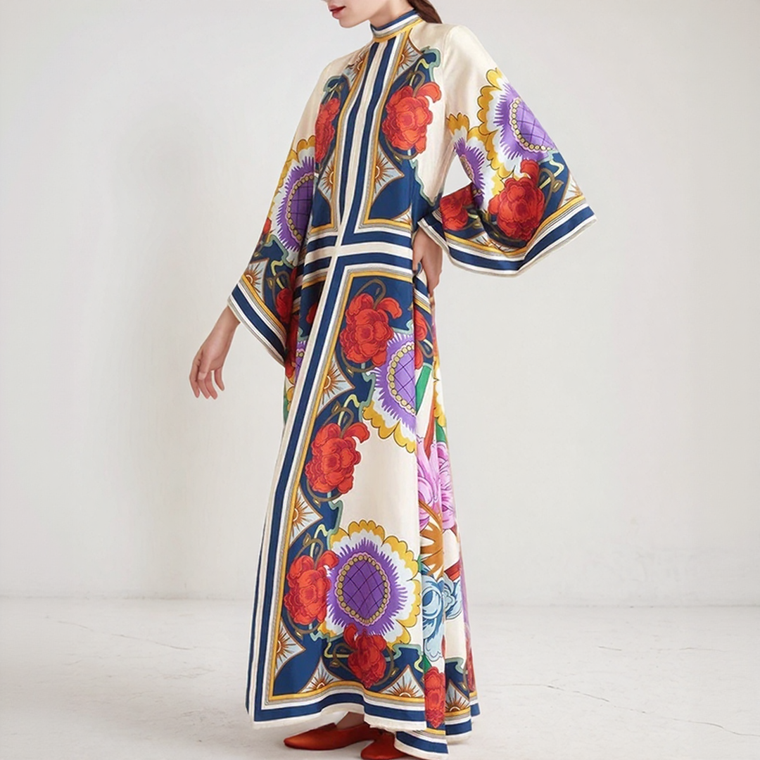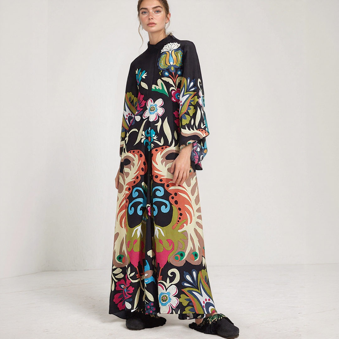 Ez a hosszú ruha merész virágmintákkal és folyékony szabással rendelkezik. A nyakán lévő magas gallér, hátul csomóval díszítve, kifinomult érintést ad. Tökéletes minden évszakra, időtlen bohém eleganciát kínál.