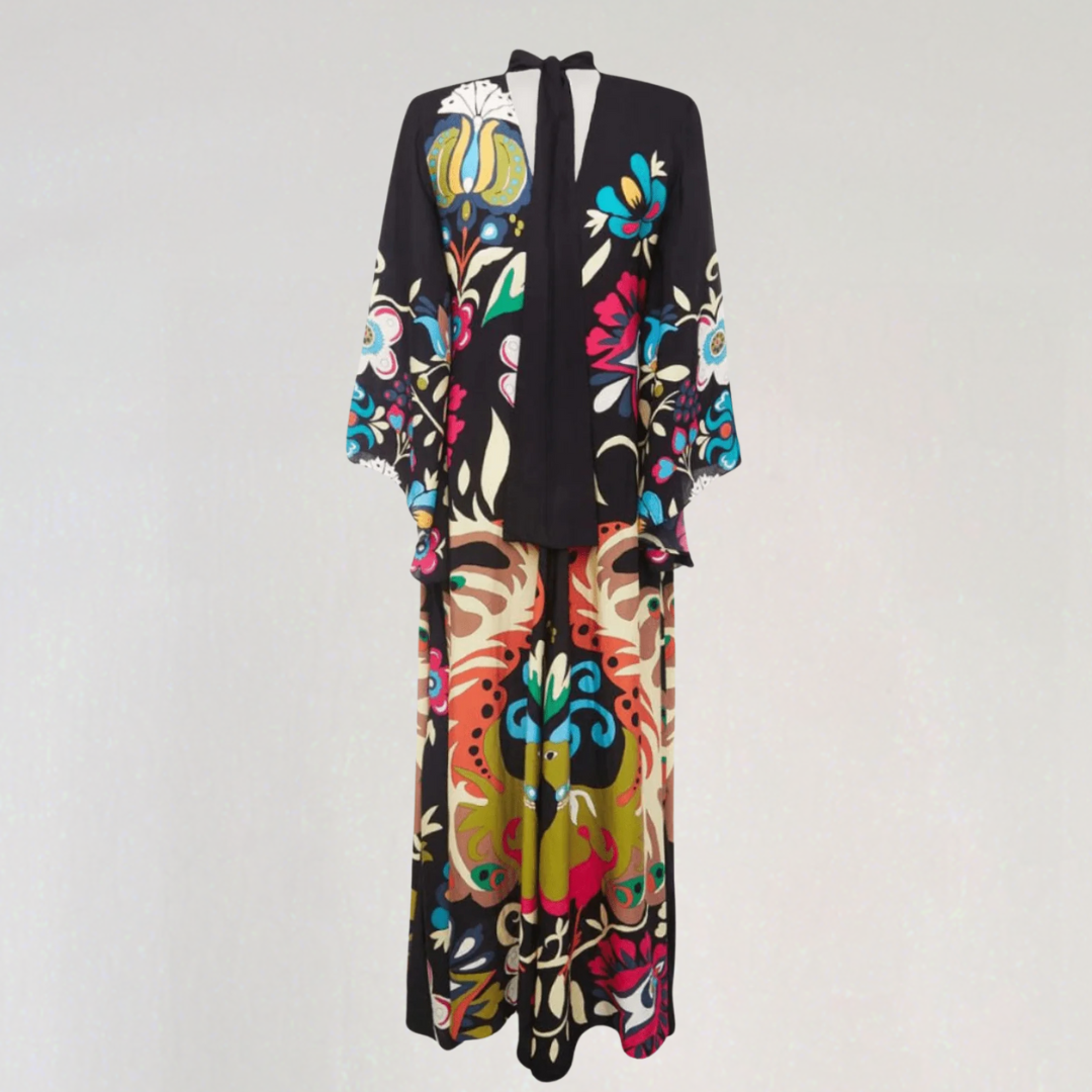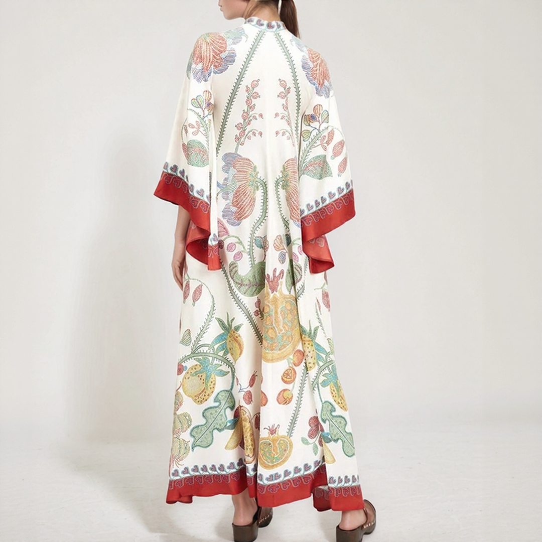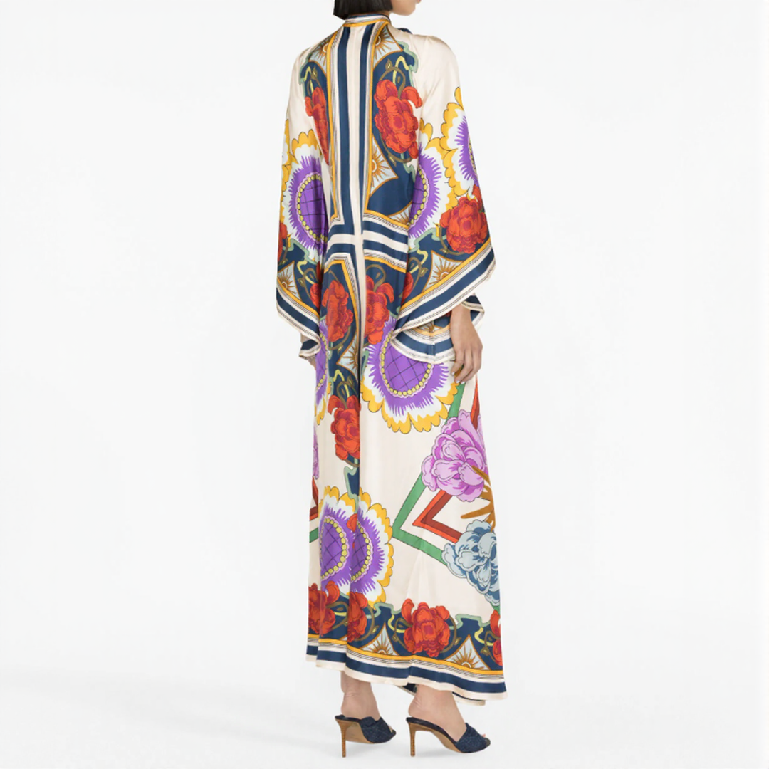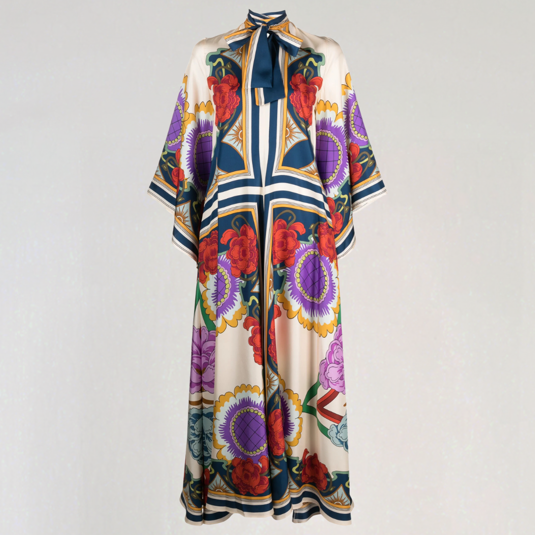 Ez a hosszú ruha merész virágmintákkal és folyékony szabással rendelkezik. A nyakán lévő magas gallér, hátul csomóval díszítve, kifinomult érintést ad. Tökéletes minden évszakra, időtlen bohém eleganciát kínál.