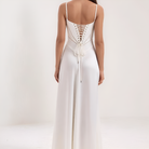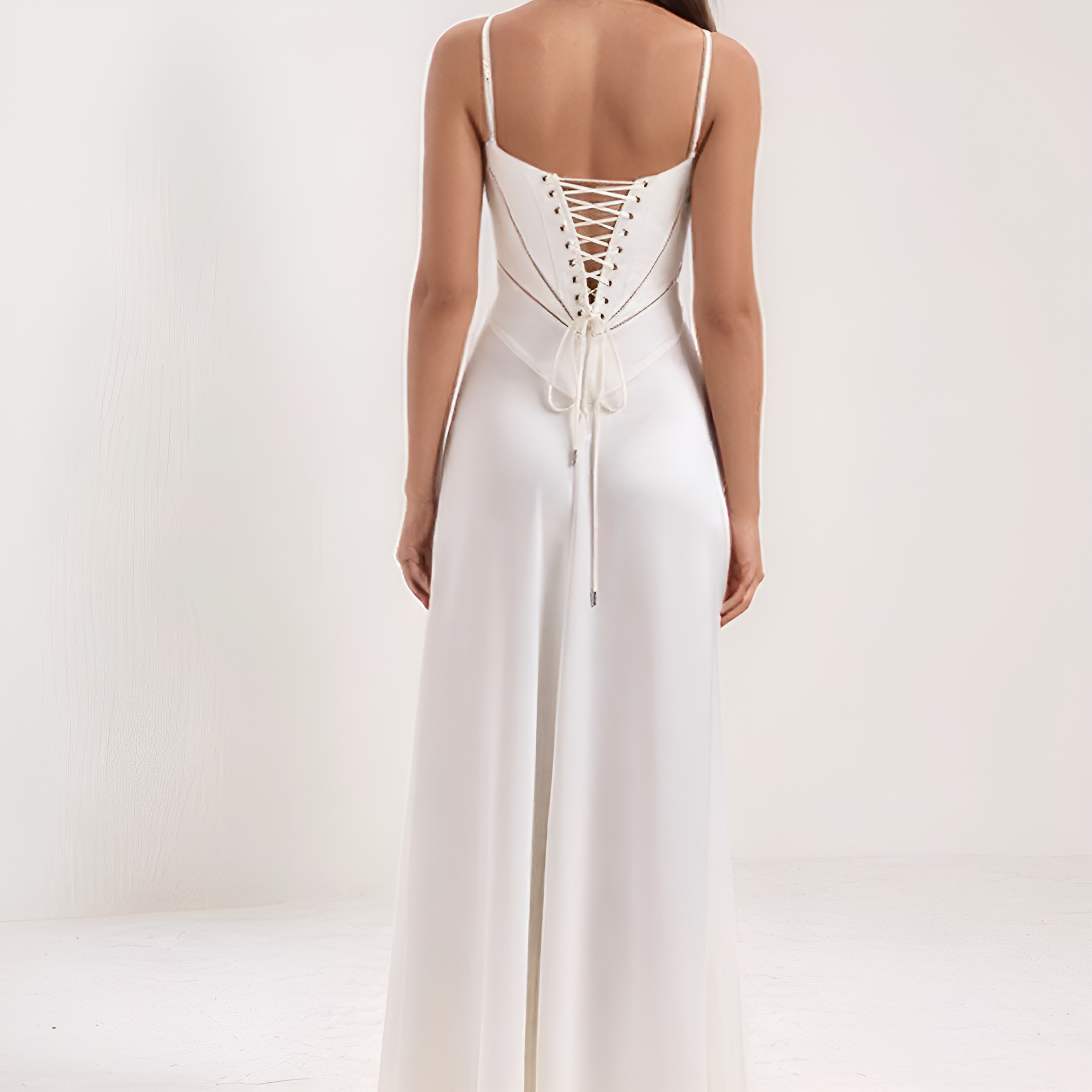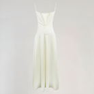このロングドレスは、コルセット風のコルセットがウエストを繊細に強調し、シルエットを引き立てます。流れるようなカットが動きと優雅さをもたらし、コルセットの背中がロマンティックで構造的なタッチを加えます。夜のイベント、ガラ、またはセレモニーに最適です。