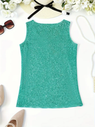 このノースリーブトップは、魅力的なVネックデザインです。全体にスパンコールが施されており、あなたのコーディネートに輝きを加えます。お祝いの場やカジュアルなルックを引き立てるのに最適です。