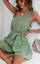 Deze korte jumpsuit met één schouder heeft een moderne en verfijnde snit. Perfect voor warme dagen, het combineert comfort en stijl. Het asymmetrische ontwerp voegt een vleugje originaliteit toe aan uw garderobe.