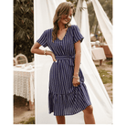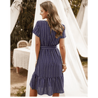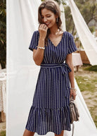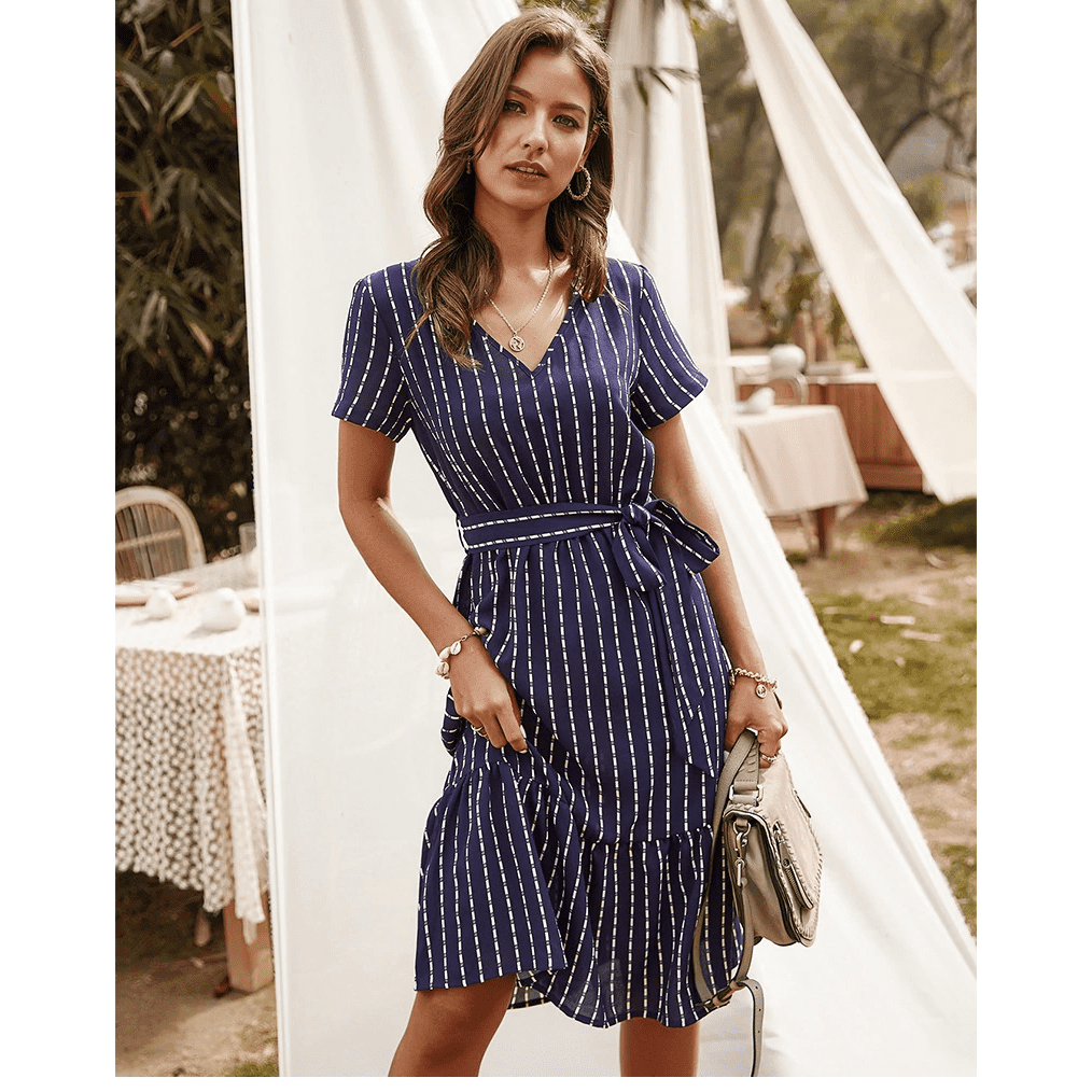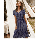 Met zijn marineblauwe tint, V-hals en geknoopte taille, weerspiegelt deze korte jurk perfect de hippie-chic geest. De asymmetrische snit geeft een delicaat moderne touch. Ideaal voor een romantische avond of een zomerse uitje.