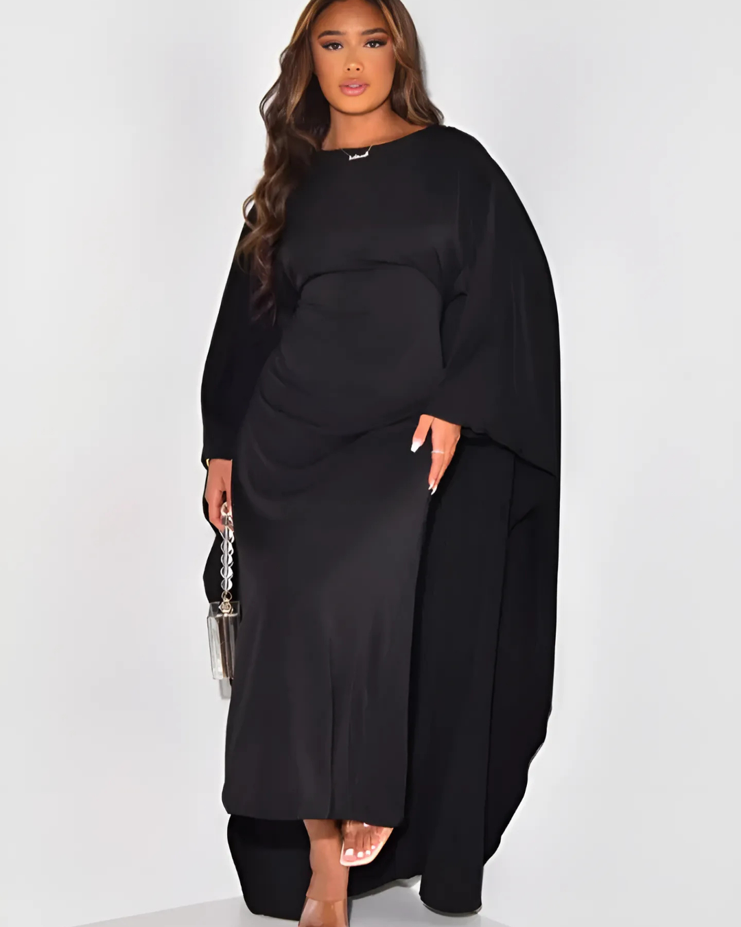 Această rochie lungă întruchipează grația și feminitatea cu o siluetă fluidă și detalii atent lucrate. Decolteul său rotund clasic și mânecile drapate adaugă o notă de rafinament în același timp delicat. Perfectă pentru ceremonii, cine formale sau seri elegante.