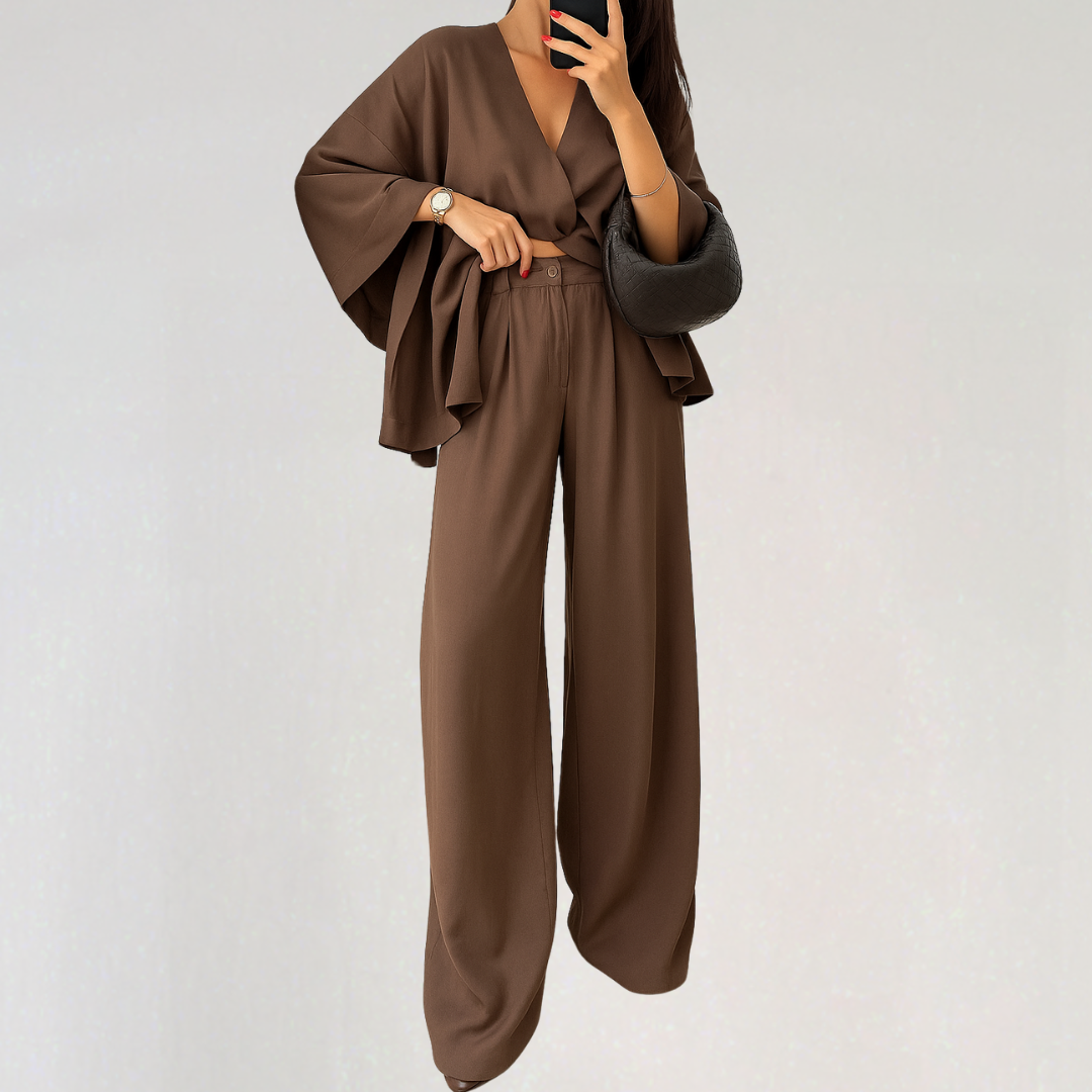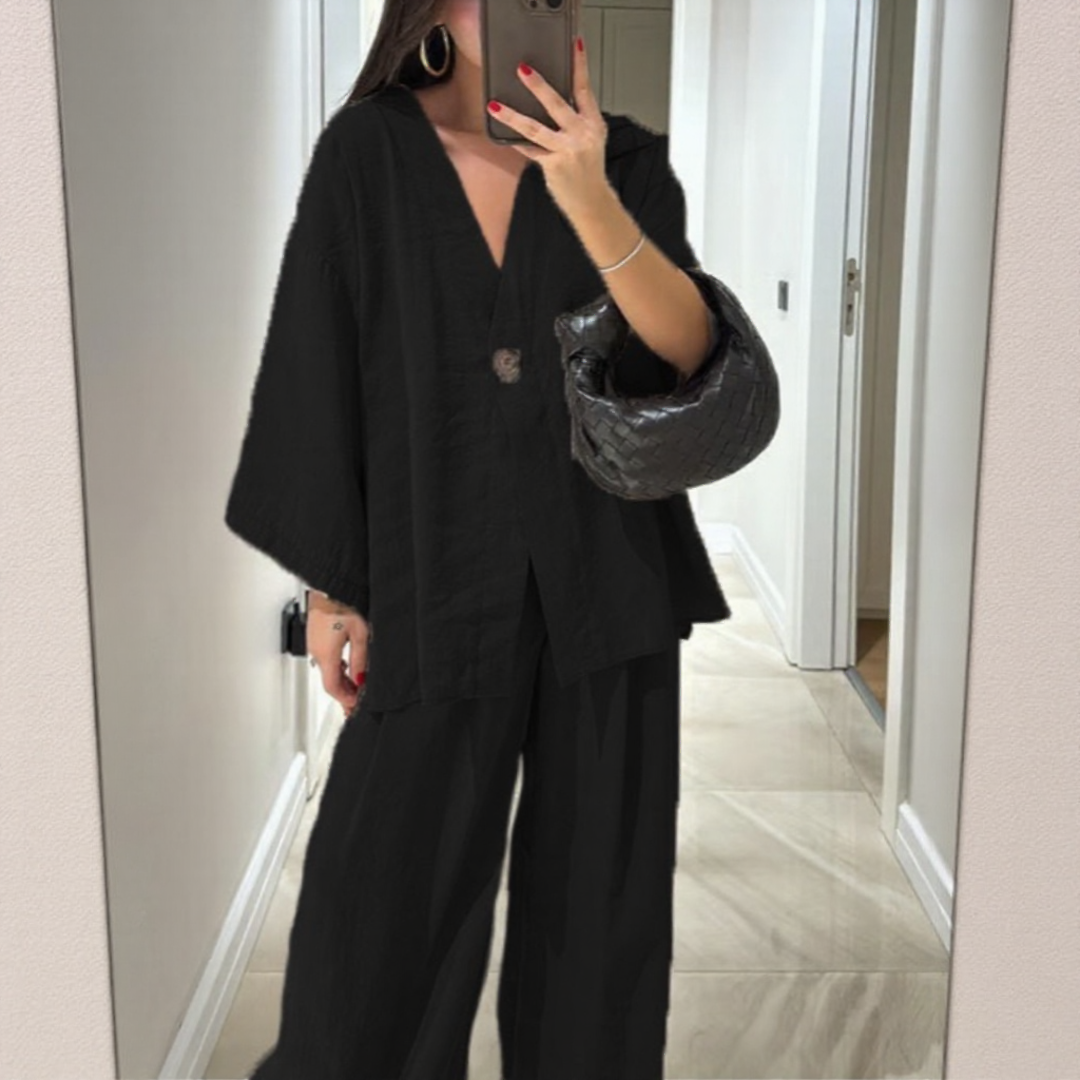Această ținută combină o tunică fluidă cu o pereche de pantaloni largi pentru o siluetă elegantă. Construită pentru a oferi o libertate de mișcare optimă, este ideală pentru zilele călduroase. Perfectă pentru ieșiri relaxate sau momente de relaxare acasă.
