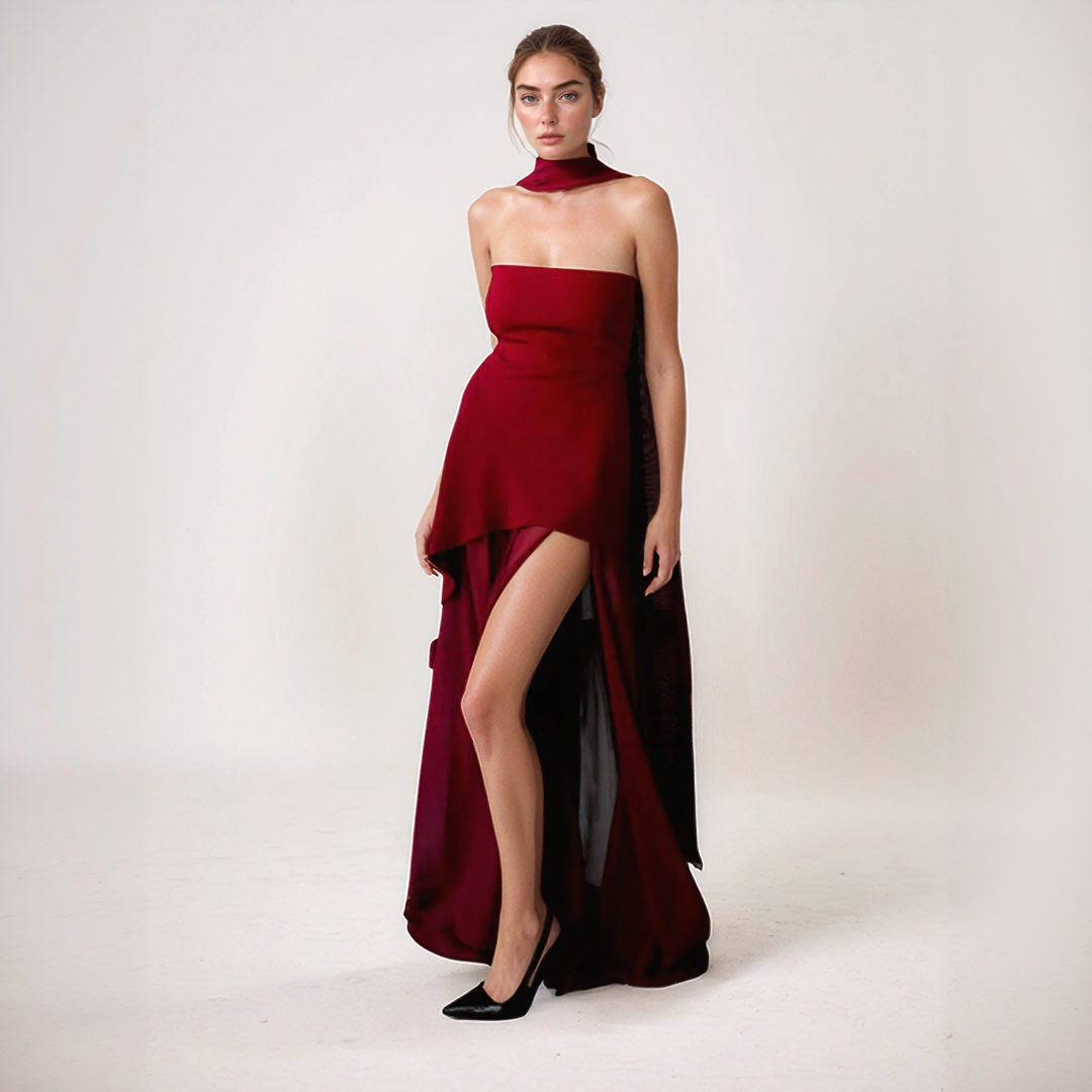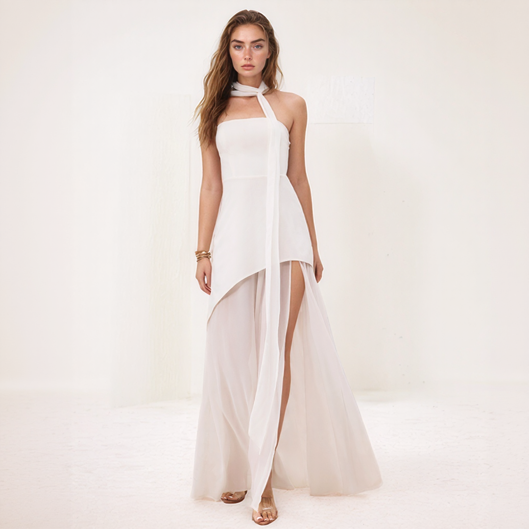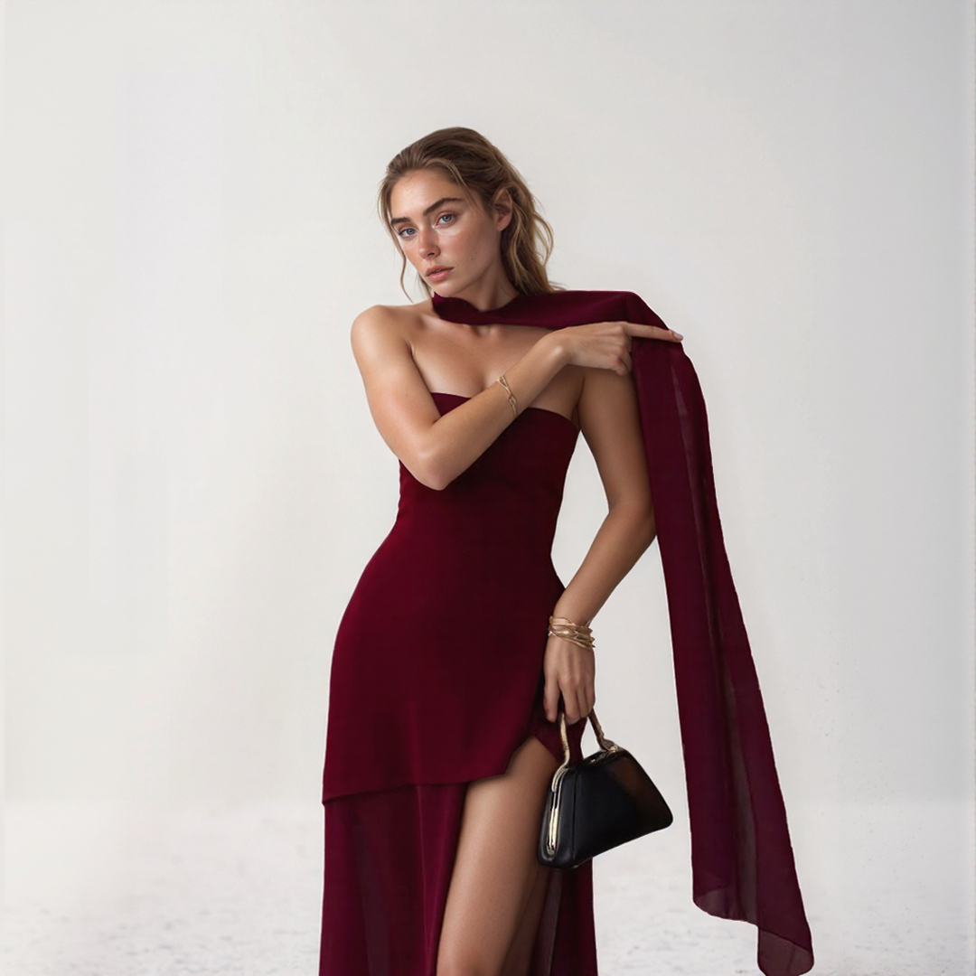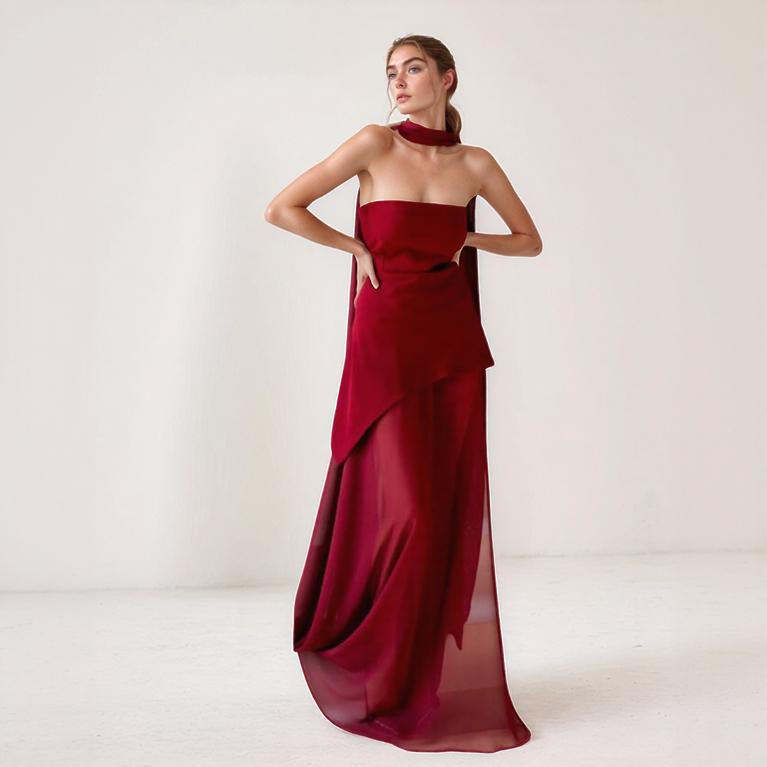 Nelly | Rochie Lungă Elegantă – Croi Asimetric și Foulard Integrat