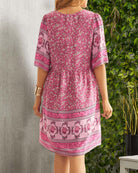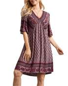 Denna boho-klänning har en smickrande V-ringning och ett elegant mönster. Dess flödande passform säkerställer optimal komfort hela dagen. Perfekt för avslappnade tillfällen eller sommarutflykter.